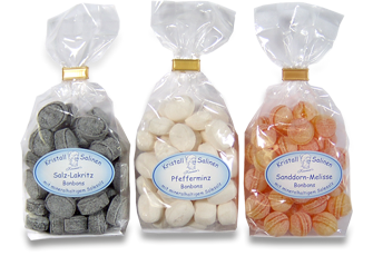 … wird zu den natürlichen Stoffen 5% gesättigte Sole hinzugefügt. Die Konzentration der Zubereitung beträgt 1,2% (Salzgehalt) und befindet sich damit  im physiologischen Bereich (erhaltende Funktionen).Unsere Bonbon-Spezialitäten werden ohne künstliche Farb– und Aromastoffe und ohne künstliche Süßstoffe hergestellt.Die Bonbons sind anregend für die Schleimhäute, wirken trockenem Hals entgegen und wirken ausgleichend auf den Salzhaushalt nach körperlicher Anstrengung wie z.B. Sport.